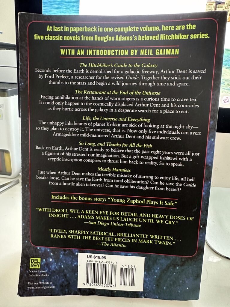 The Ultimate Hitchhiker’s Guide to the Galaxy is one BIG book full of Hitchhiker books. Unless I’m forgetting one, which is possible, you are getting them all for the price of one. So let’s discuss the economics of books for a second.